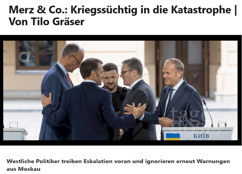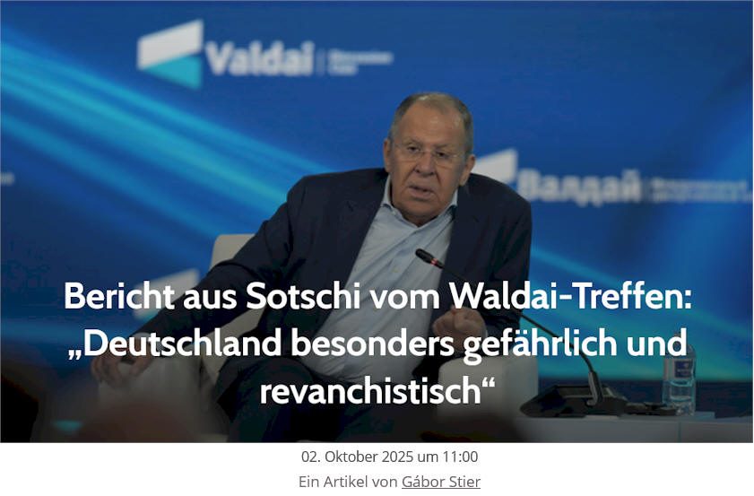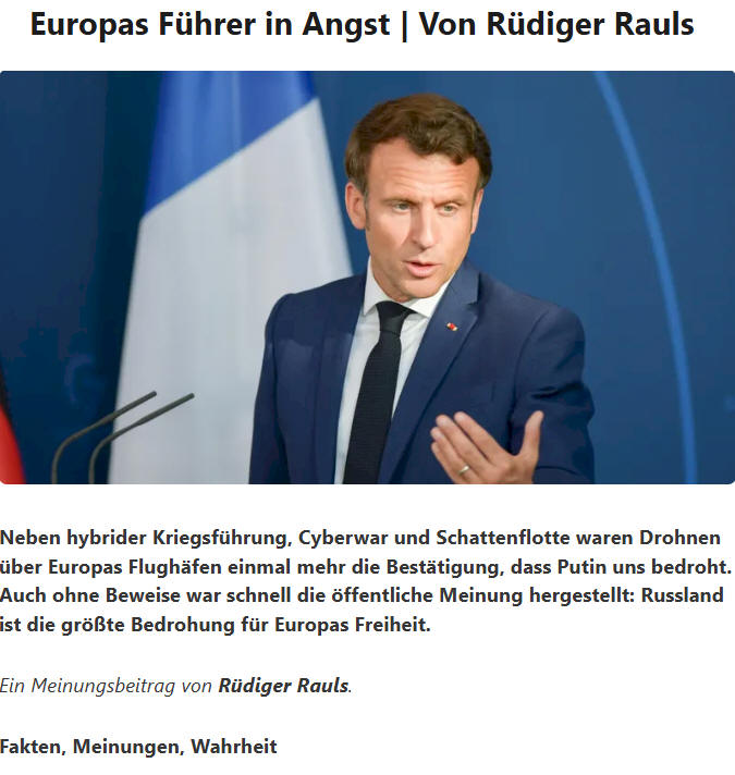 . Links zu den Artikeln: https://anti-spiegel.ru/2025/deutsche-medien-bezeichnen-burevestnik-als-eines-der-duemmsten-systeme-die-man-sich-vorstellen-kann/ https://anti-spiegel.ru/2025/warum-in-russland-die-forderungen-nach-einem-harten-vorgehen-gegen-die-eu-lauter-werden/ https://anti-spiegel.ru/2025/russland-droht-erstmals-mit-dem-einsatz-von-atomwaffen/ https://anti-spiegel.ru/2025/die-eu-ist-bereits-im-krieg-mit-russland/ https://anti-spiegel.ru/2025/regierungskrise-in-belgien-wegen-des-streits-um-die-enteignung-der-russischen-vermoegenswerte/ https://anti-spiegel.ru/2025/die-eu-kommission-will-den-eu-laendern-die-aufnahme-von-krediten-fuer-kiew-vorschlagen/ https://anti-spiegel.ru/2025/wie-schlecht-geht-es-der-russischen-wirtschaft/ https://anti-spiegel.ru/2025/ursula-und-die-kloschuesseln-oder-wie-man-in-russland-ueber-die-neuen-eu-sanktionen-denkt/ https://anti-spiegel.ru/2025/nun-europa-ist-an-der-reihe-chips-aus-kuehlschraenken-auszubauen/ https://anti-spiegel.ru/2025/die-neuen-us-sanktionen-gegen-russland-treffen-auch-deutschland/ https://anti-spiegel.ru/2025/die-sanktionen-koennten-trumps-wichtigste-errungenschaften-treffen/ https://anti-spiegel.ru/2025/teil-1-polen-unterstuetzt-terrorismus-gegen-deutschland-und-europa/ https://anti-spiegel.ru/2025/warum-haben-in-der-eu-in-einer-nacht-zwei-raffinerien-gebrannt-die-russisches-oel-verarbeiten/ https://anti-spiegel.ru/2025/wenn-der-schwanz-mit-dem-hund-wedeln-will/ https://anti-spiegel.ru/2025/rheinmetall-tochter-spendet-vor-abstimmung-ueber-ruestungsprojekte-an-abgeordnete/ https://anti-spiegel.ru/2025/austritte-von-radioaktivitaet-drogen-und-vergewaltigungen-der-desolate-zustand-der-royal-navy/ https://anti-spiegel.ru/2025/der-spiegel-laesst-seine-artikel-von-der-ki-schreiben/ |