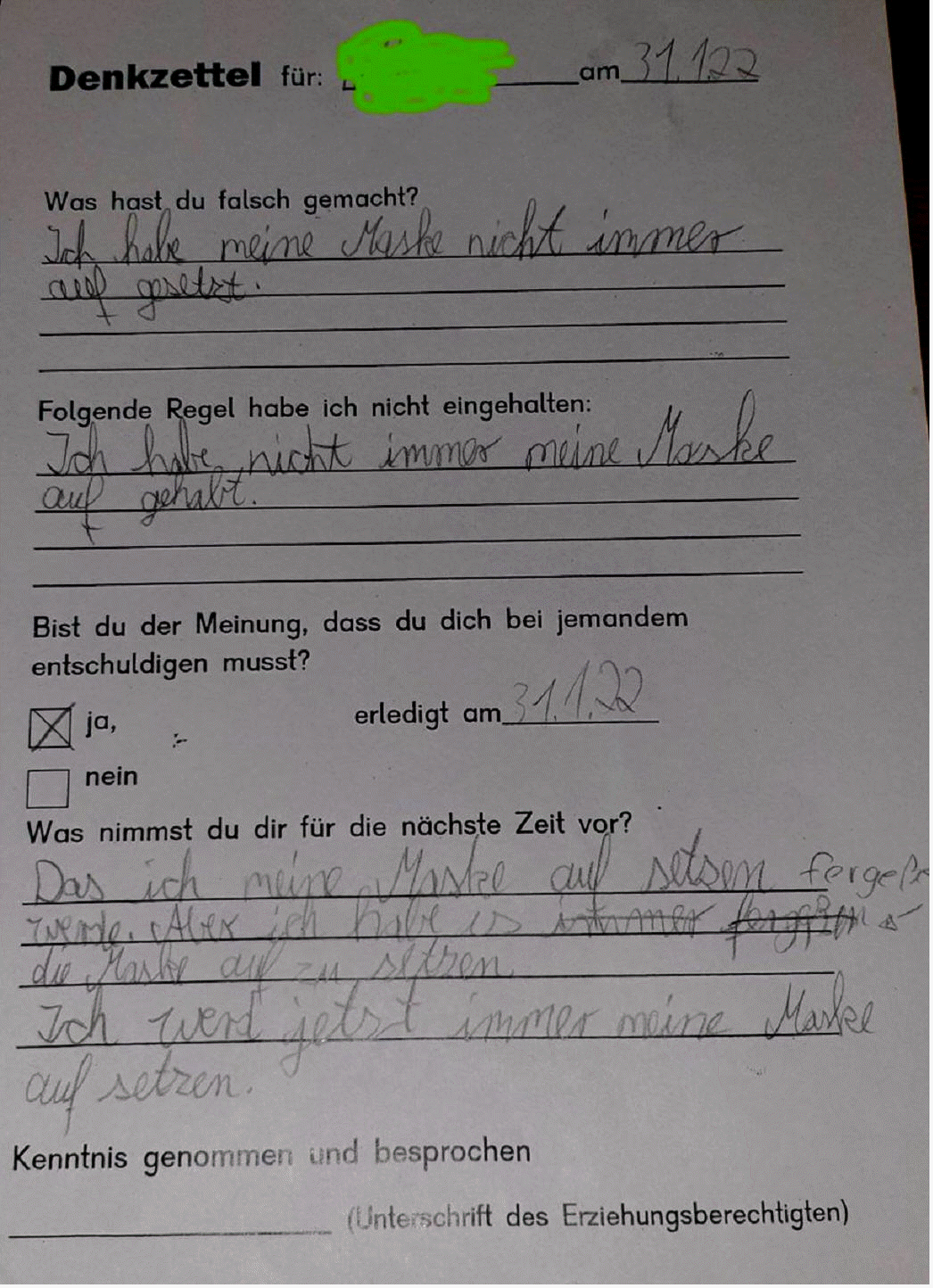 HA-heft, weil er die Maske im Unterricht 2x abgenommen hat.