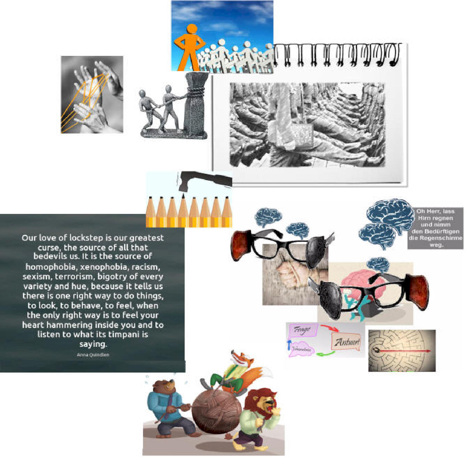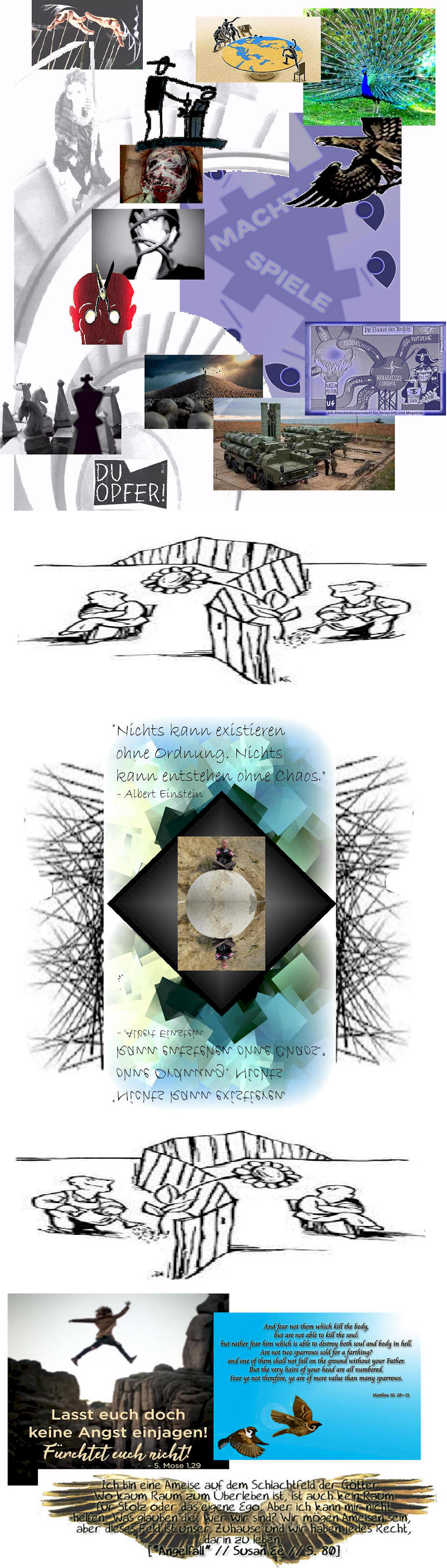 Denn: Keine Kränkung wird s o je erneut lebensspendende Gesundung finden - - und erlittene Verwundungen werden fortfahren zu bluten. . . ! . - GLEICHSCHRITT nämlich schließt keine Wunden, die Ersatz-Bindungen, die er scheinbar bietet, sind unweigerlich tödliche Fesseln. . . GLEICHSCHRITT lässt außer sich nichts gelten, er betäubt Ohr und Herz, signalisiert unbrechbare Zwingherrschaft und verachtet die Vielfalt der Potentiale derer, derer er sich bedient, wie derer, die zu zertreten er antritt . . . - . . . in dem sie alle nicht zuletzt selbst zerreißenden MINENFELD, das keinen ihrer Befehliger kümmert . . . !! . . .. . . . . . * . . ERZÄHLEN WIR EINANDER DOCH VON UNSERER WELT ENDLICH (AUCH WIEDER) SO, . . . DASS WIR WEIT WEIT MEHR ALS DIE AUF IHR VORFINDLICHEN MESSGRÖSSEN IN UNSERE WAHRNEHMUNG RÜCKEN ! ! ! . . . ALSO SO: DASS WIR UNS NICHT BEVORZUGT BLINDLINGS UNENDLICHEN BEFUND-ANHÄUFUNGEN UND ALGORITHMISCHEN MUSTER-ERKENNUNGEN VERSCHREIBEN . - hingegeben an eine Steuerbarkeits-Sucht, die auf so oder so vorstellungs-kompatible ´Modellierungen von Rechen-Modellen´ setzt, um den immer verwirrend-lebendigen Wirk-Vorgängen in und zwischen allem Existenten geglaubt denkbar effizient beizukommen - die Verhältnisse wie nie zuvor bewegend - . . . . weil in den Untersuchungs-Verfahren möglichst unvermischt steril, also primär statistisch-rechnerisch - - - . . . und weil in den darauf beziehbaren Gestaltungs-Verfahren so machtorientiert-autoritativ wie möglich - - - . . . . - - - das alles fern jeden Gespürs für die ganze Fülle und Vielfalt dessen, was in allem und um alles herum .
