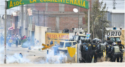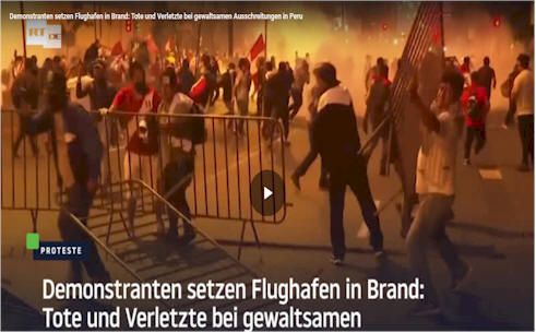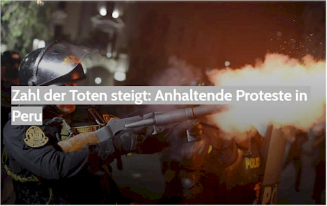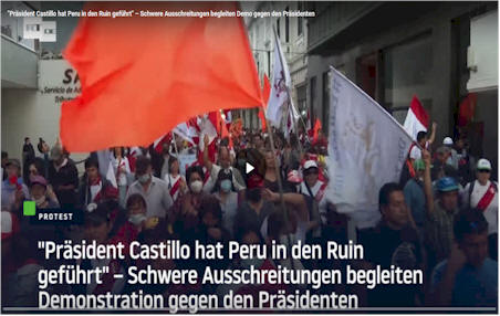 - Kaum Rückhalt für neue Präsidentin. Massenproteste im ganzen Land fordern Neuwahlen. Regierungen in Lateinamerika bewerten Situation unterschiedlich | / 21 Nov. 2022 "Präsident Castillo hat Peru in den Ruin geführt": Schwere Ausschreitungen in Peru - Hunderte von Menschen gingen am Sonntag in der peruanischen Hauptstadt Lima auf die Straße, um gegen Präsident Pedro Castillo zu protestieren. Als sie in Richtung des Regierungspalastes zogen, errichtete die Polizei Barrikaden, um ihr Vorankommen zu verhindern. Bei dem Versuch der Demonstranten, die Barrieren zu entfernen, setzte die Polizei Tränengas ein. |
