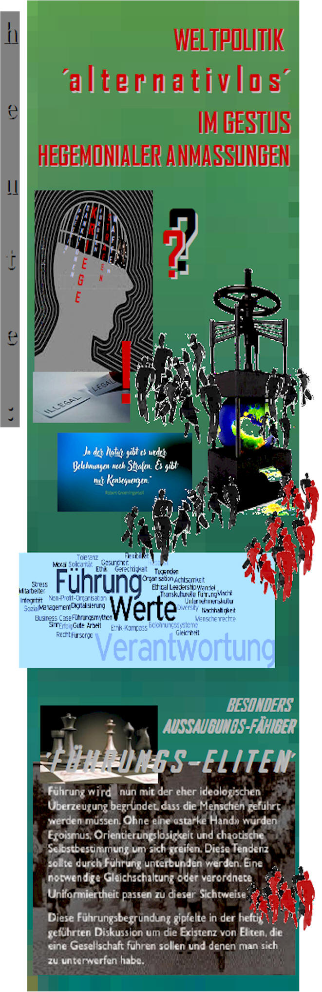 welche Ordnung im Staatengefüge soll sein ? - welcher Art die Souveränität . . . ? - welcher Art die Interessenabstimmung . . . ? - wie der Schutz vor Fremdbestimmung . . . ? - wie die Gewährleistung von Friedens-Fähigkeit . . . ? // AUFGRUND WELCHER WIE AUSGESTATTETEN ORGANISATORISCHEN ZWISCHENSTAATLICHEN VERMITTLER . . . ? - wie imperial, und damit poltisch polbildend - zwischen uni-, über duo- bis hin zu mutipolaren Ausprägungen . . . ? - oder etwa alle in frei schwingender Parallelität . . . ? |