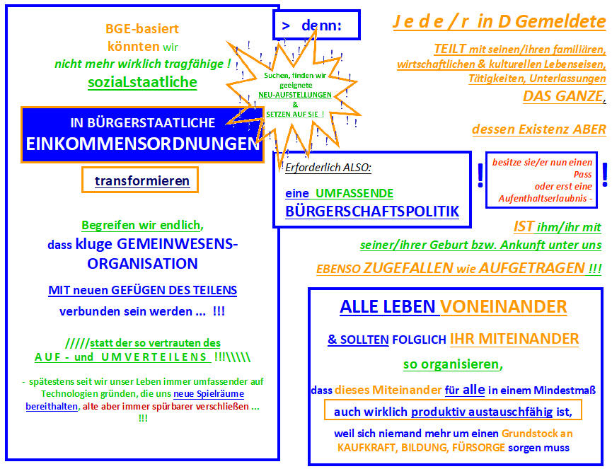 zudem: _______________________________________________________________ - traditionelle Krankenversicherung zugunsten eines paritätischen Gesundheitsfonds (PGF), auszustatten mit derzeit ggf. 400 € /Kopf (= ~410 Mrd €/Jahr ): / zur Hälfte (200 Mrd.) pro Kopf aus dem BGE zu leisten / und zur Hälfte (200 Mrd.) unternehmens-seits : = ~ 3,50 €/geleisteter Arbeitsstunde (bei ~ 60 Mio Arbeitsstunden 2017 - oder ausgleichend mehr bei geringerem Arbeitsstunden-Volumen pro Betrieb ) ![]() - es erübrigten sich des weiteren: _____________________________ - Arbeitslosenversicherung - Rentenversicherung - Kindergeld Der Gesetzgeber hat für ein Erwerbs-Arbeitsrecht zu sorgen, demzufolge gälte: